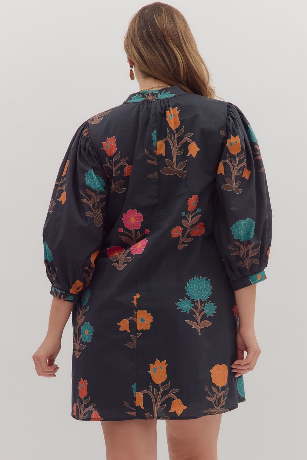 Floral print 3/4 sleeve mini dress featuring pleated shoulder detail and V-neck. Side pockets. Lined. Woven. Non-sheer. Lightweight.
