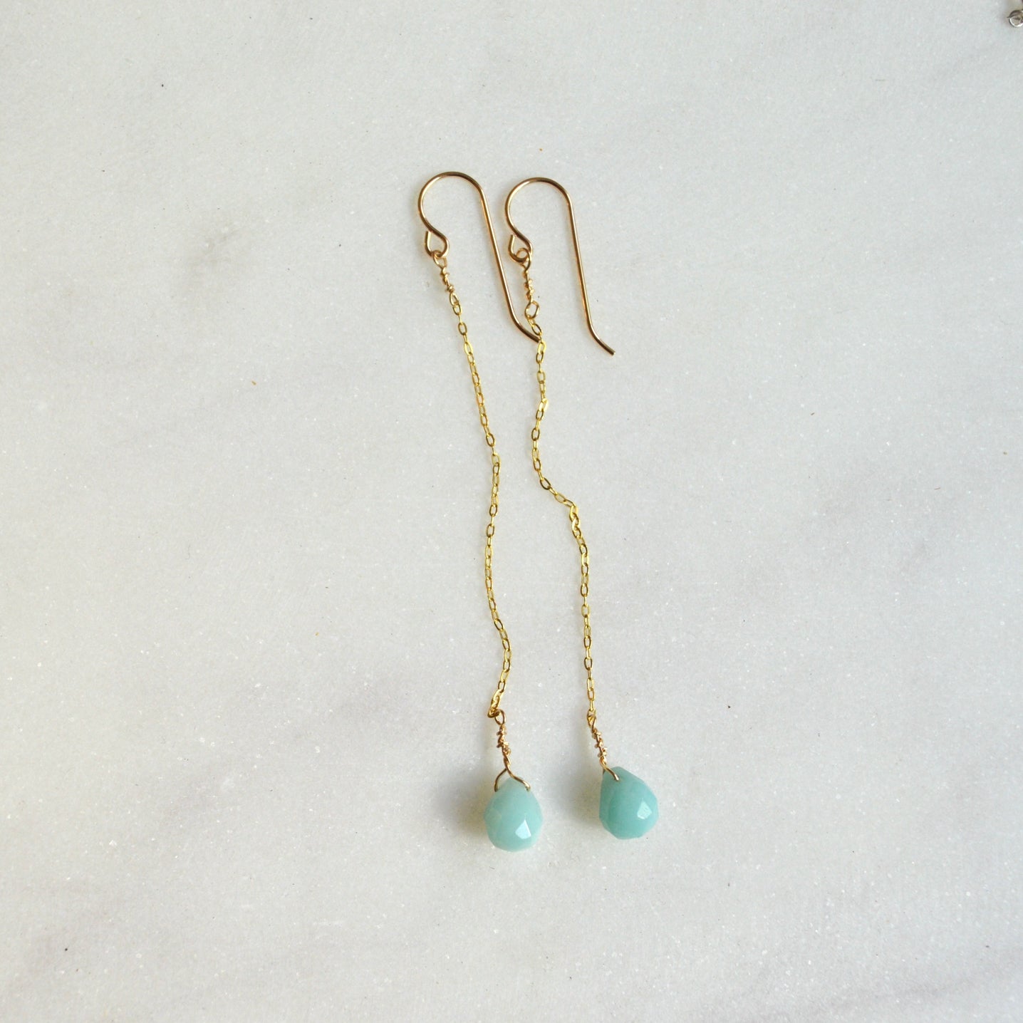 This is a miniature version of my Amazonite teardrop earrings if you're looking for something a little daintier. Tiny 6x8mm faceted Amazonite teardrops dangle from 2" 14k gold filled 1mm flat cable chains.