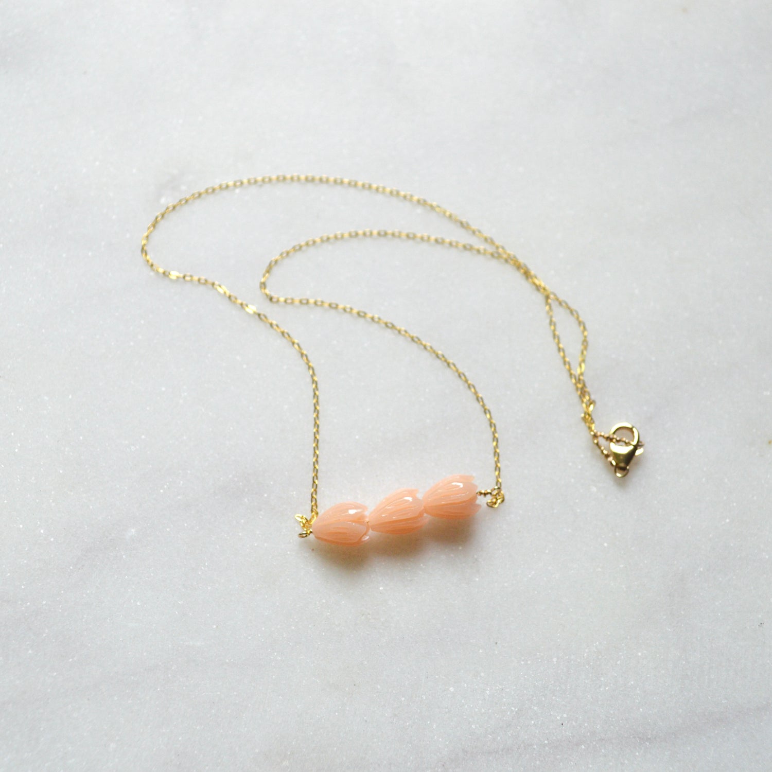 Sweet peach colored pikake flower beads are strung onto a 14k gold filled 1mm flat cable chain.